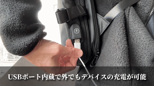 モバイルバッテリーを使ってリュックからスマホなどの充電も可能。