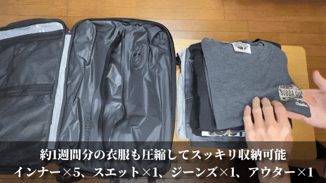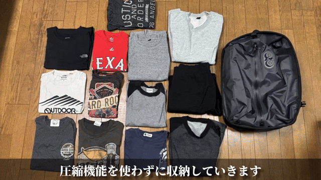 溢れる衣服を圧縮できるから、こんなにもたくさんの荷物をリュックに収納可能!