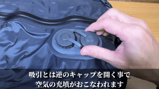 逆側のキャップを開けると圧縮袋の内部に空気が充填されます。