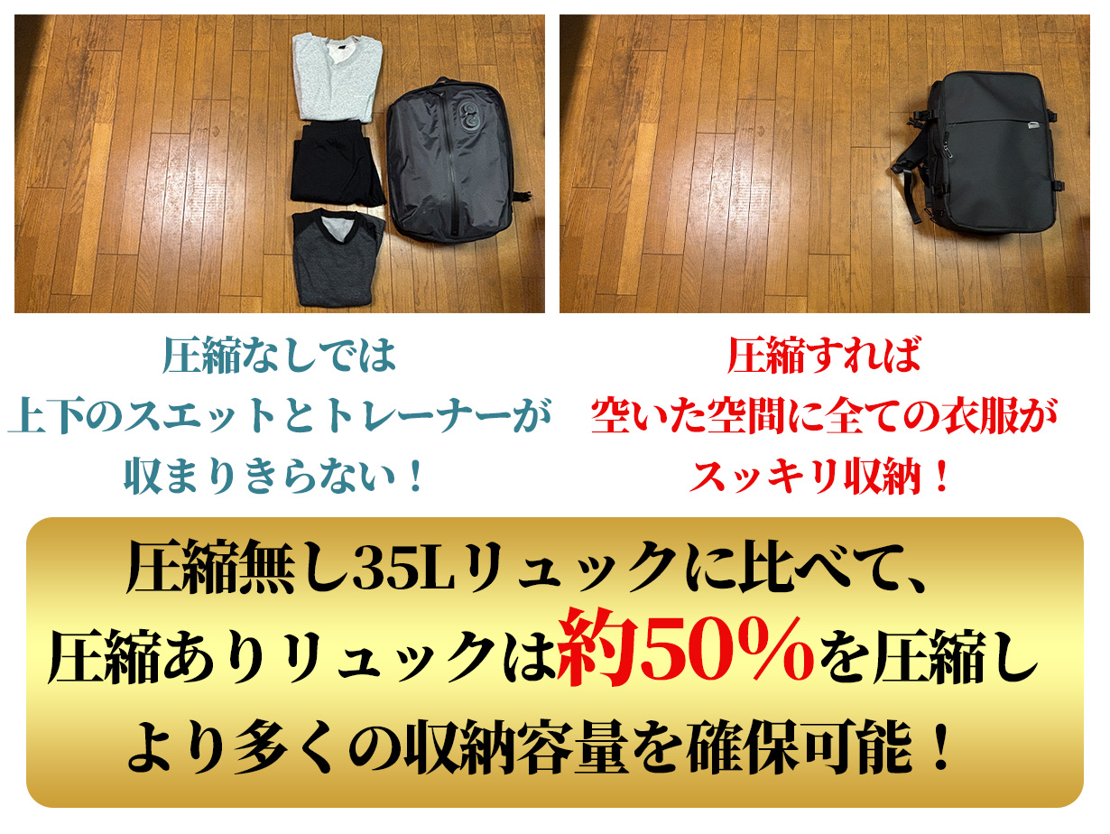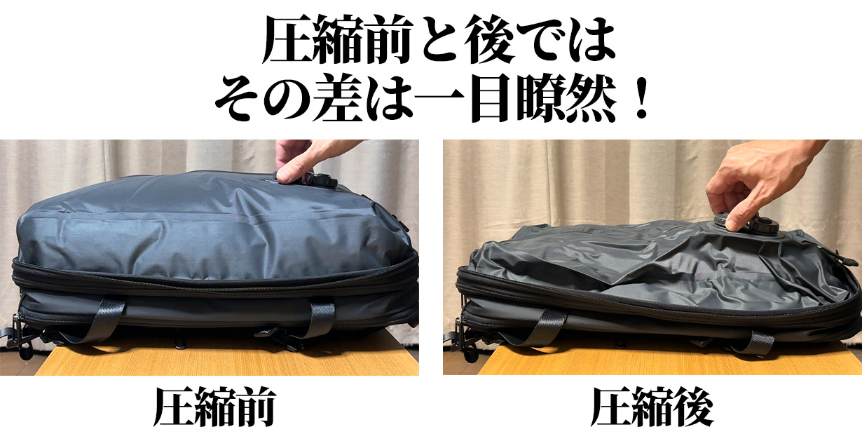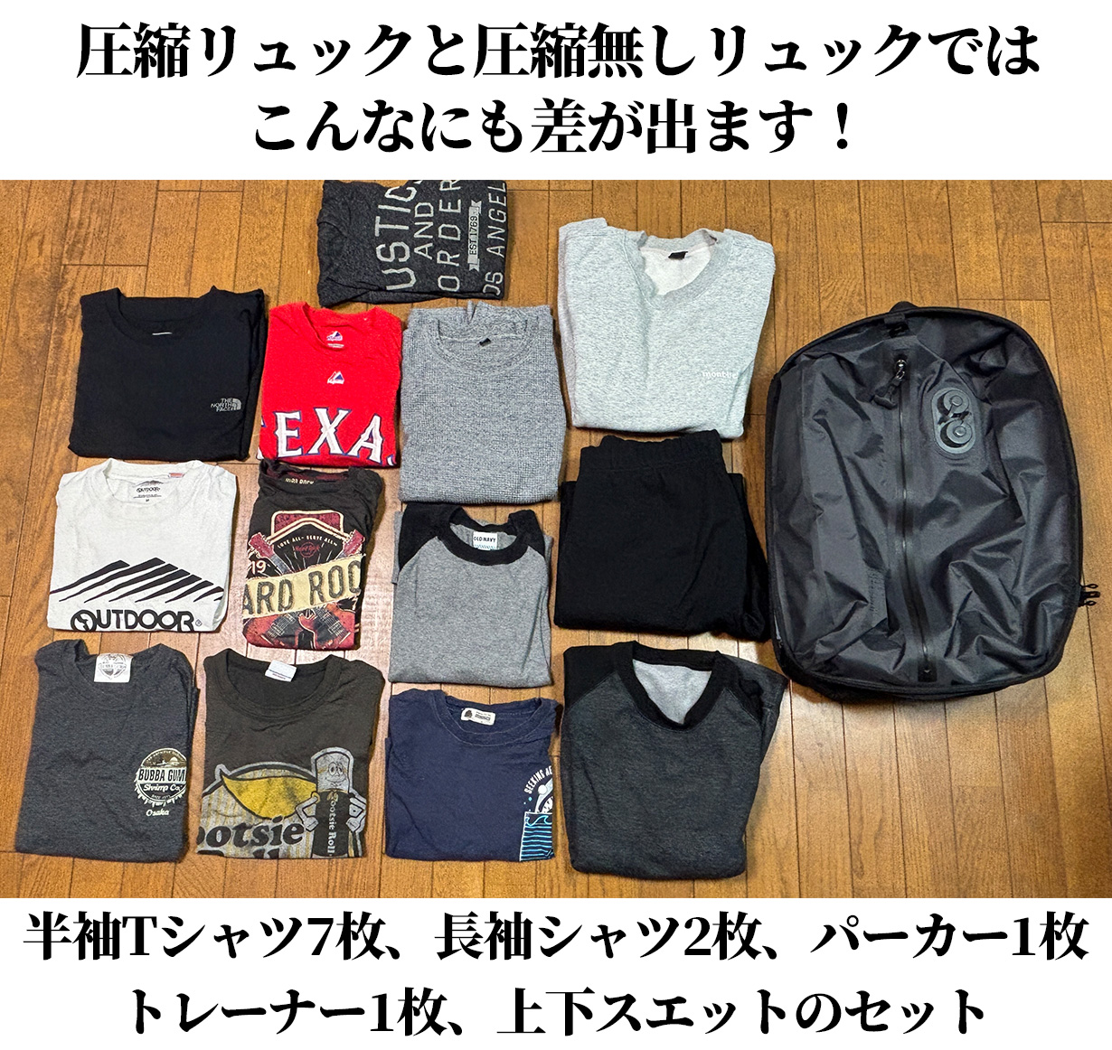 ※双方同じリュックを使用し、圧縮する場合、圧縮しない場合を比べたものです。