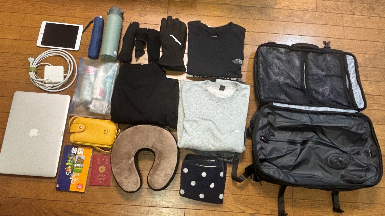 圧縮機能のない35Lのリュックではとても収まらない量の衣服です。